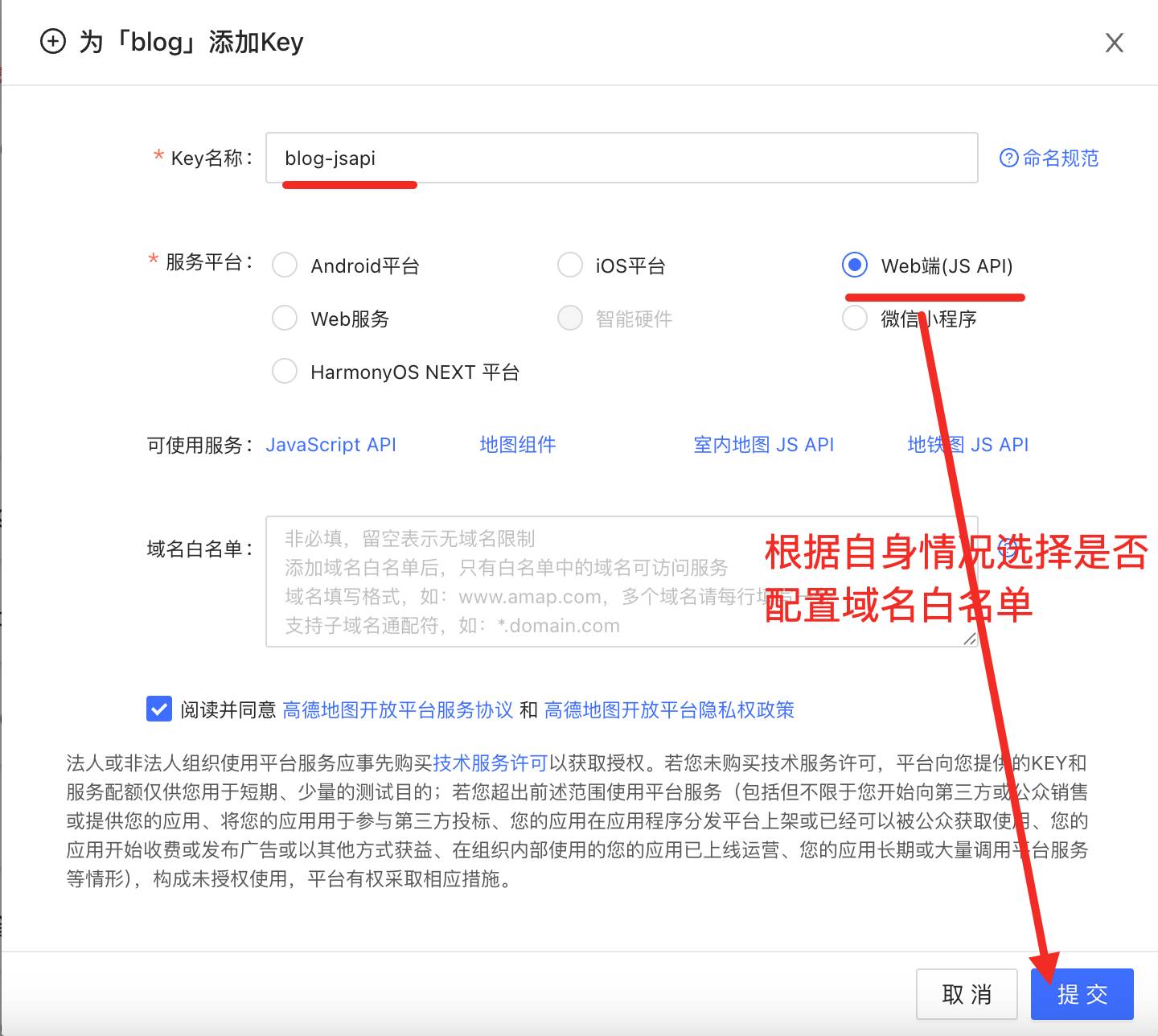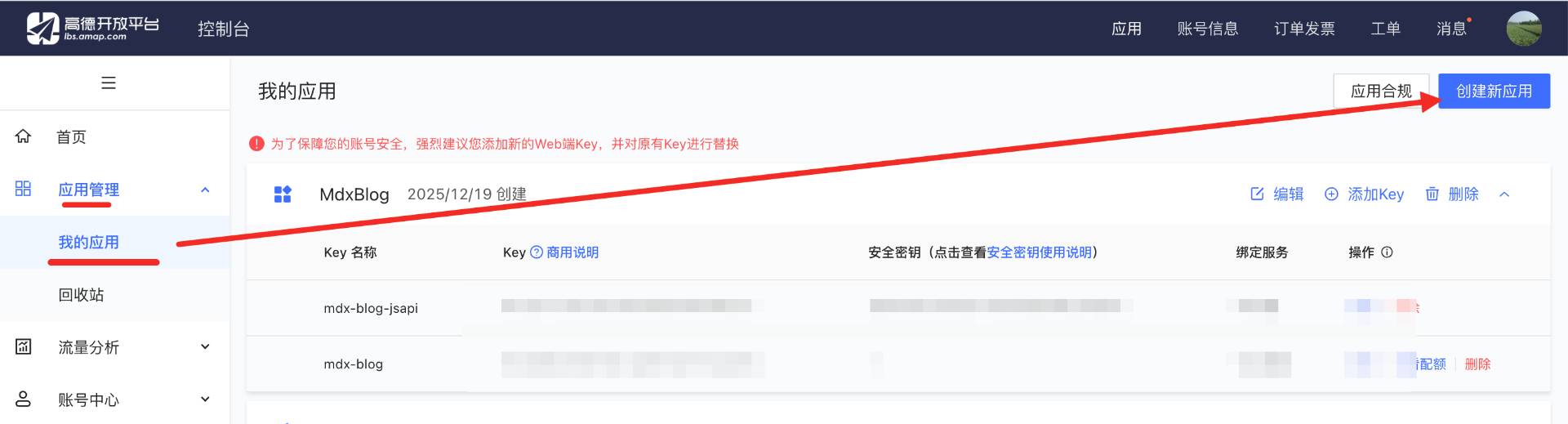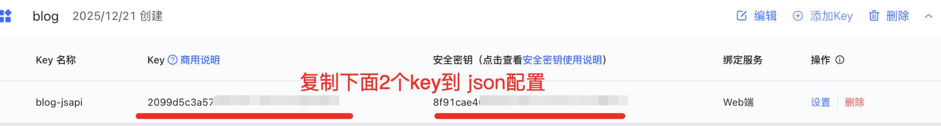 配置指南如何配置高德地图keyCreated: 12/23/2025登录高德地图 https://lbs.amap.com/ 创建应用 添加key 测试 访问http://localhost:3000/author 项目配置修改各页面JSONPrevious Page如何配置新增PostNext Page