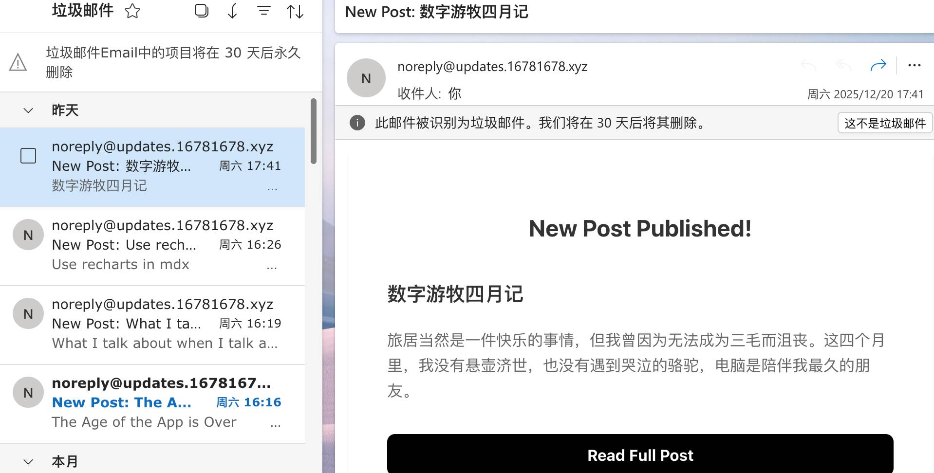 订阅用户就会收到邮件如下图(可能在垃圾邮件分组)
