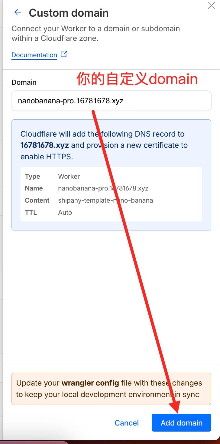 进入部署在 Cloudflare Workers 的项目管理页面,进入 Settings -> Domains & Routers 页面,点击 Add 按钮,选择 Custom Domain,输入你的自定义域名(可以是托管在 Cloudflare 的根域名,或者子域名),点击 Add Domain 按钮,添加自定义域名。