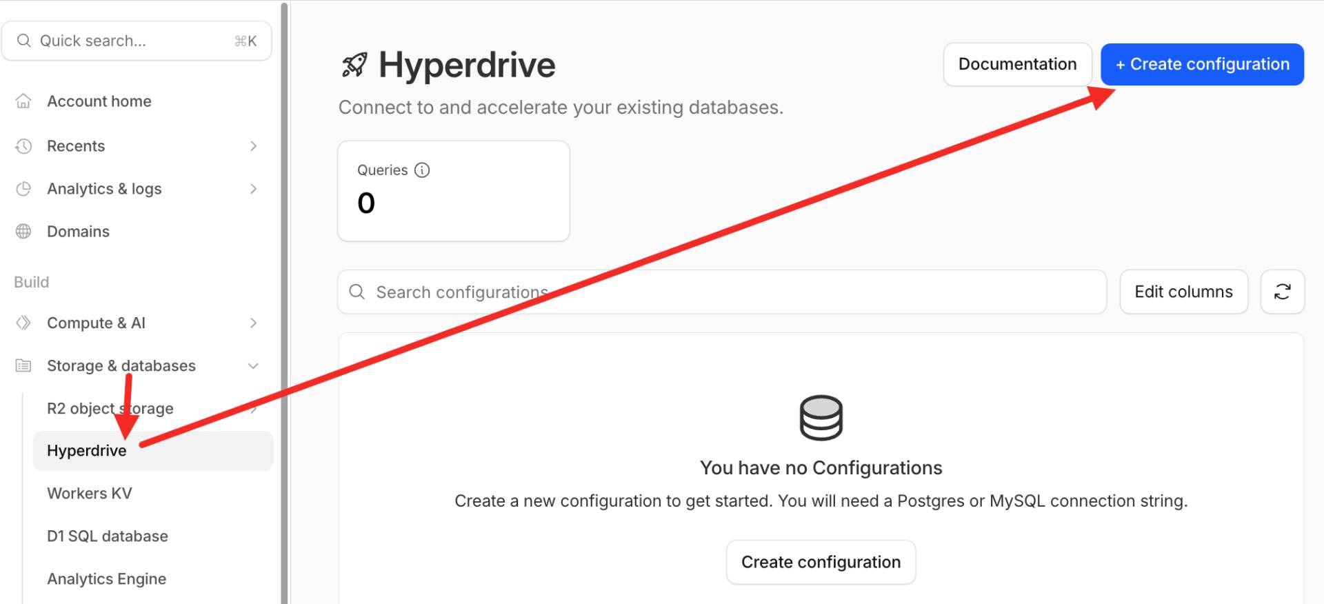 进入 Cloudflare 控制台,在 Storage & databases -> Hyperdrive 页面点击 Create configuration 按钮,创建 Hyperdrive 配置。