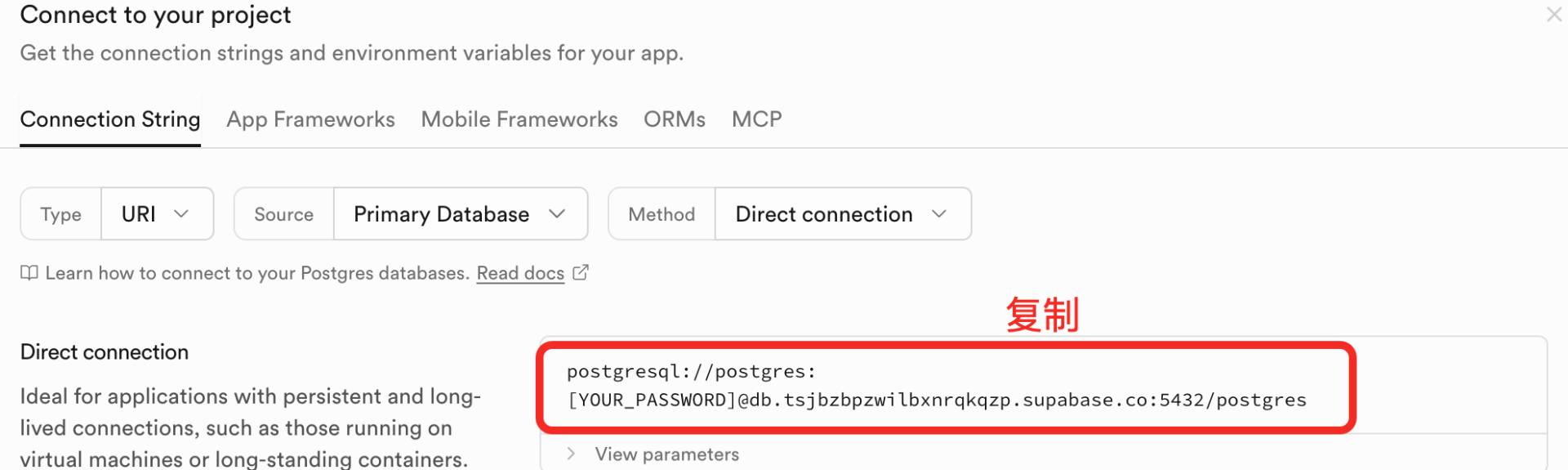 组装示例:postgres://postgres:[YOUR_PASSWORD]@db.qcddhntipeafhilqnilm.supabase.co:5432/postgres