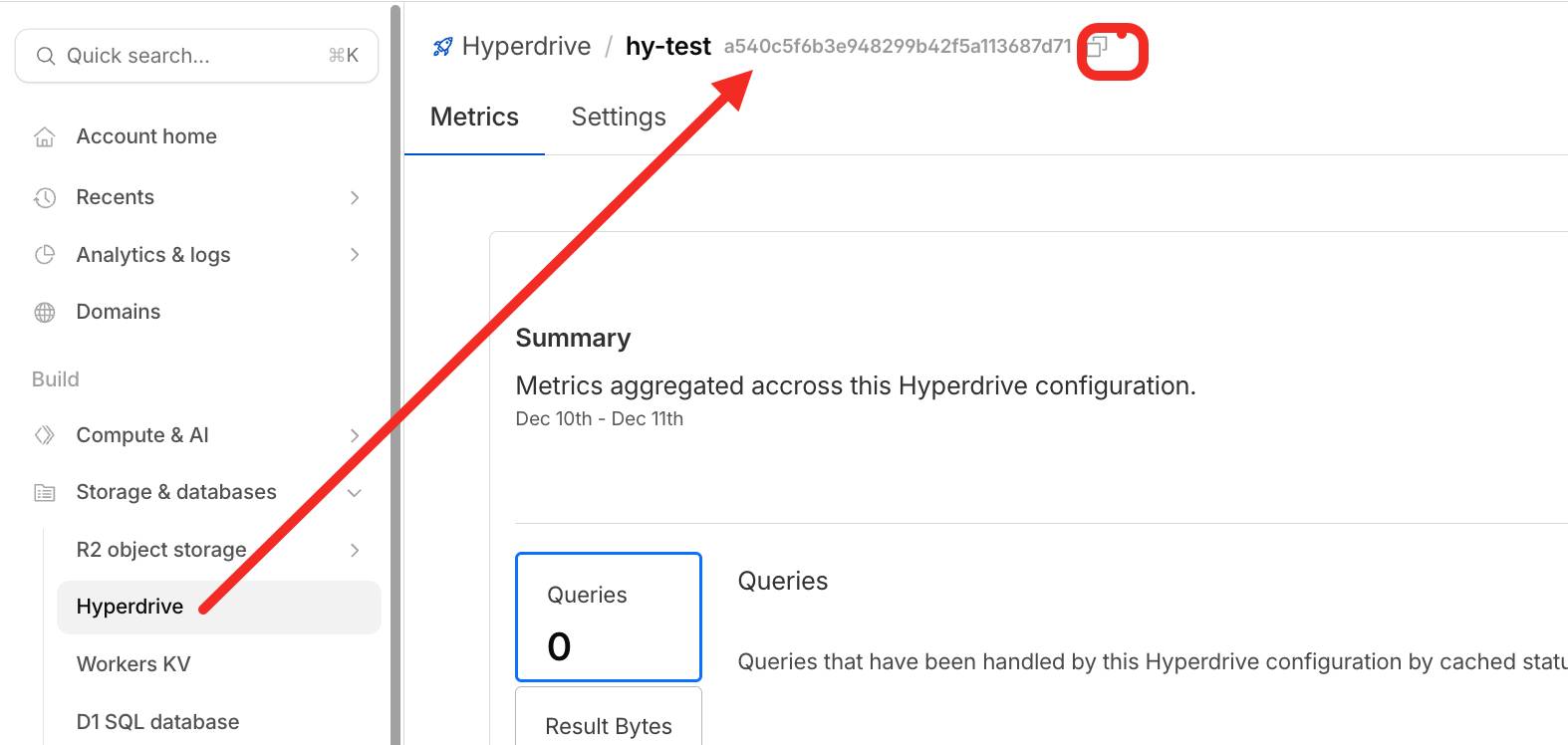 在 Hyperdrive 配置管理页面,复制 Hyperdrive 配置 ID。