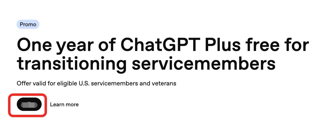 成功以后再点击链接: https://chatgpt.com/veterans-claim, 有个黑色小按钮,去绑卡就好。(因为是每月付款 0 美元账单验证,所以绑卡还是自己的比较好,避免下一个月卡失效了)