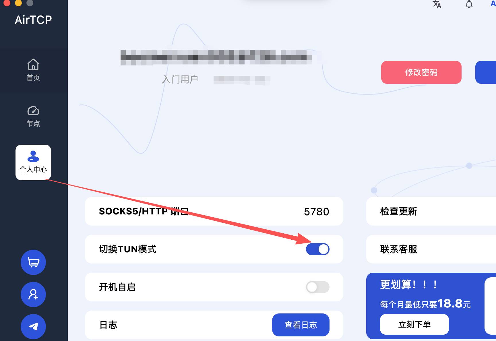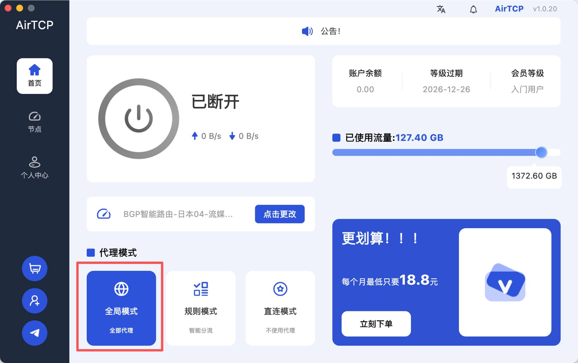 访问:https://2.airtcp.us/user/tutorial 下载官方的airtcp软件,开启全局