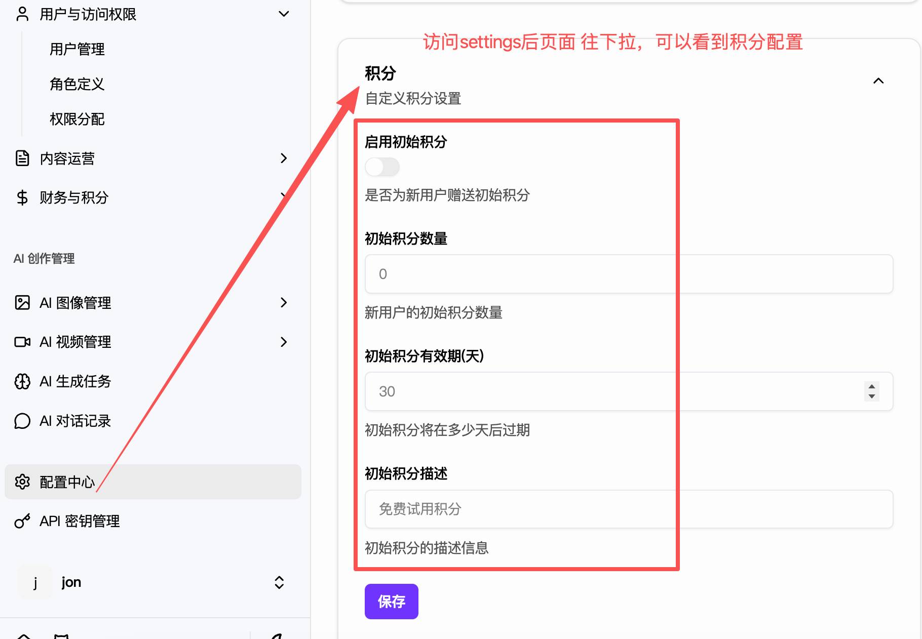 新用户注册赠送积分是需要在admin/settings/general路由下配置的,下面以中文版截图示例: