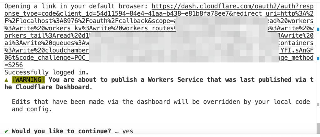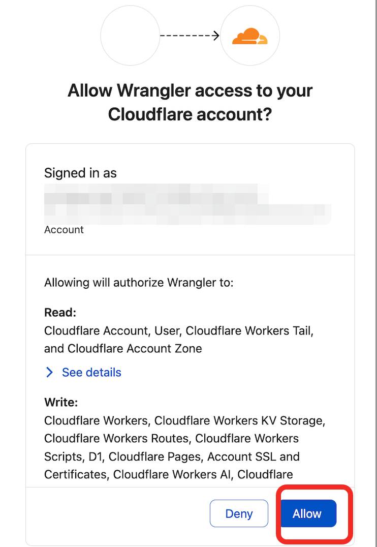 如果是第一次部署项目到 Cloudflare Workers,命令行会输出 Cloudflare 的授权地址。你需要点击打开链接,在浏览器登录你的 Cloudflare 账户,完成对项目的授权。
