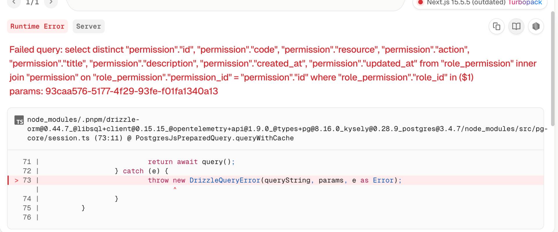 Error: Failed query: select distinct "permission"."id", "permission"."code", "permission"."resource", "permission"."action", "permission"."title", "permission"."description", "permission"."created_at", "permission"."updated_at" from "role_permission" inner join "permission" on "role_permission"."permission_id" = "permission"."id" where "role_permission"."role_id" in ($1)params: 93caa576-5177-4f29-93fe-f01fa1340a13