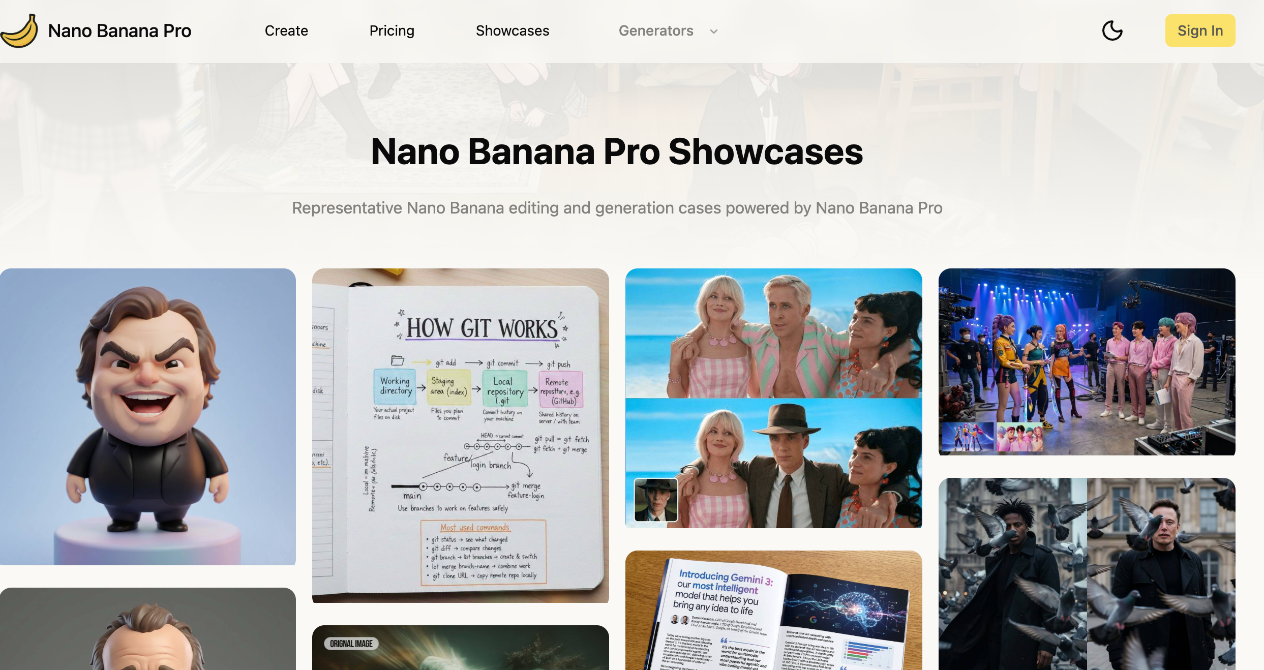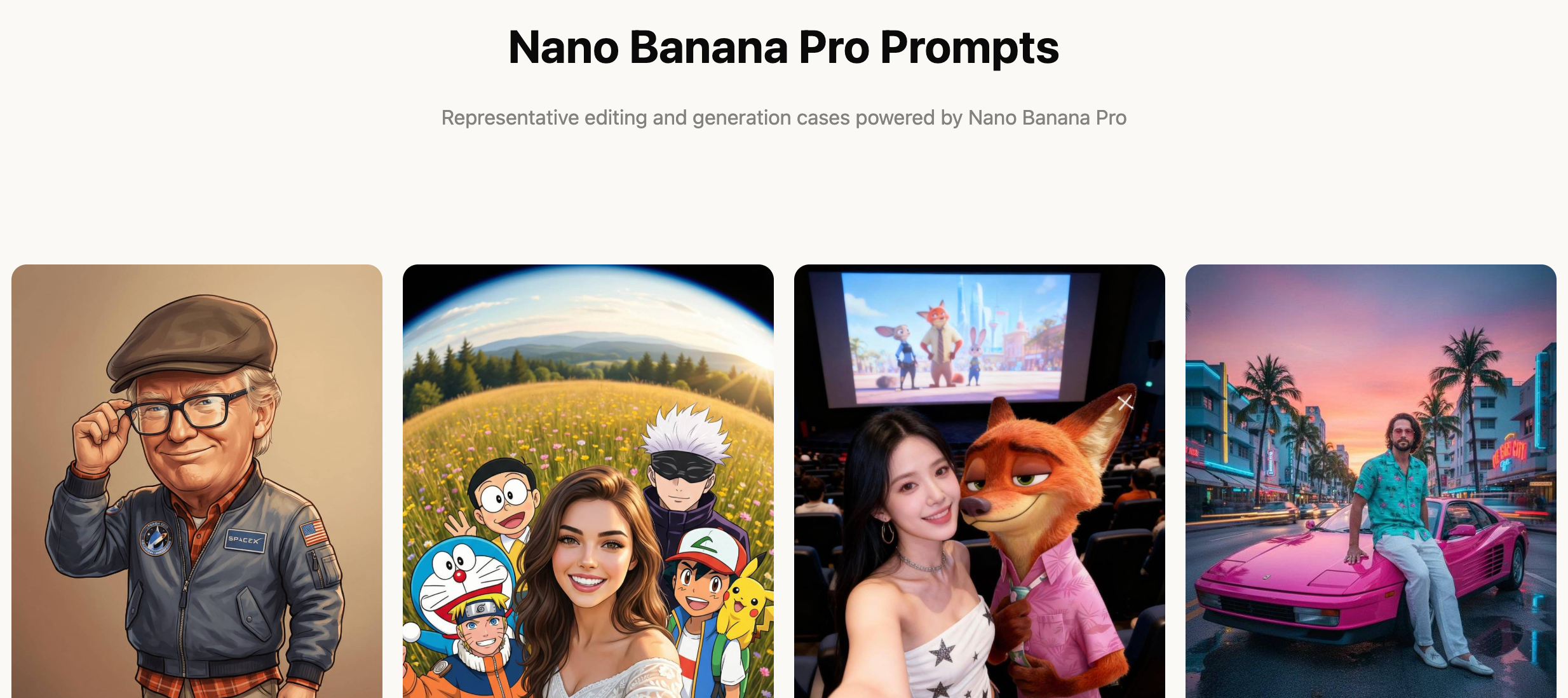 "description": "Representative Nano Banana editing and generation cases powered by Nano Banana Pro",