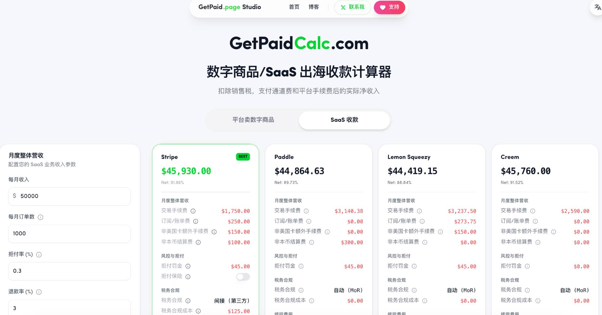 SaaS 出海收款计算器(扣除销售税,支付通道费和平台手续费后的实际净收入)
