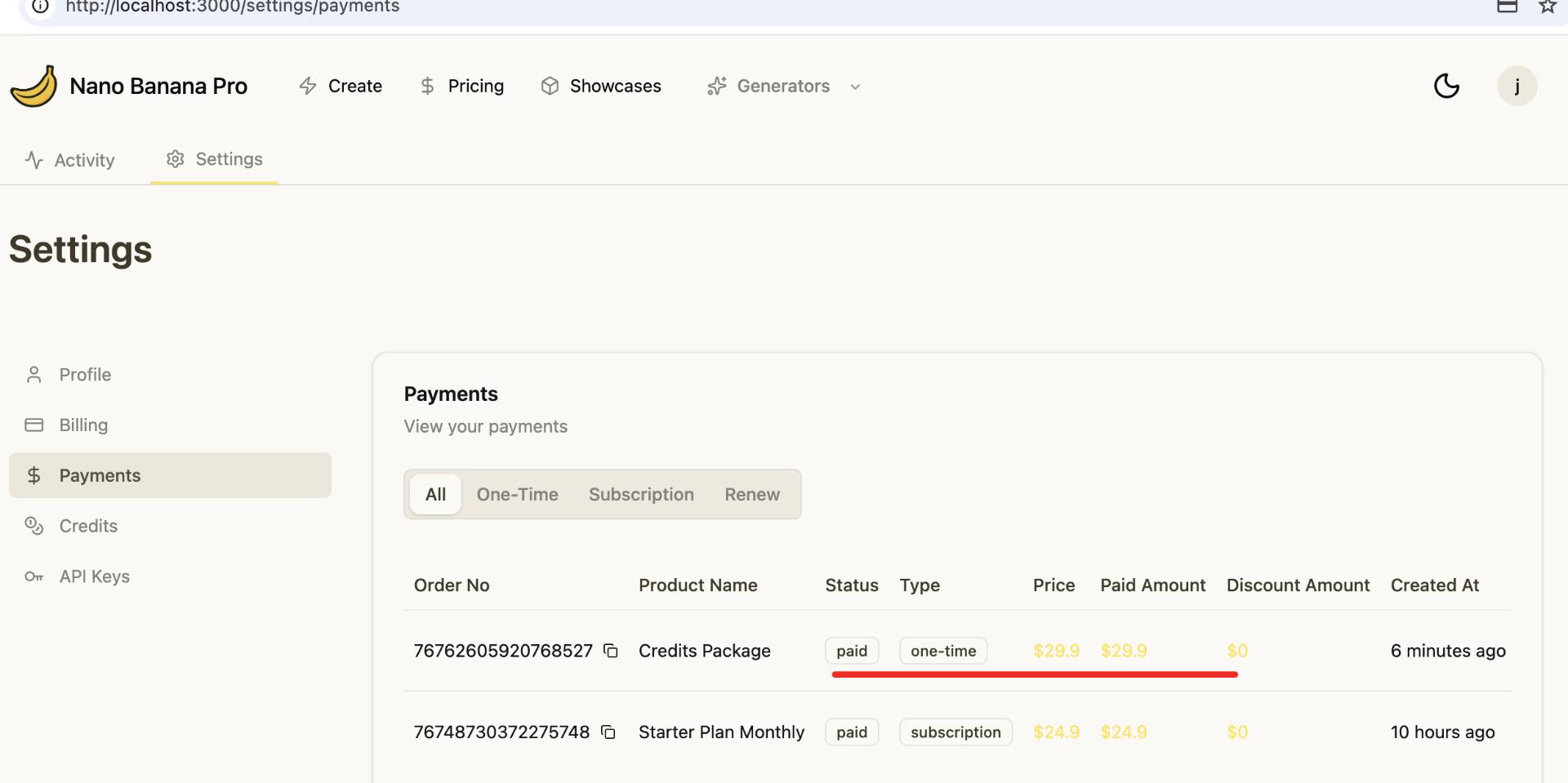 注意:修改完价格表配置后,访问 /pricing 页面查看新的价格表。选择一个价格方案下单,支付成功后,在 /settings/payments 页面查看支付记录,检查支付金额、币种、付费周期,是否与配置的价格方案一致。 在 /settings/credits 页面查看积分发放记录,检查积分数量、过期时间(支付时间 + 有效天数),是否与配置的价格方案一致。