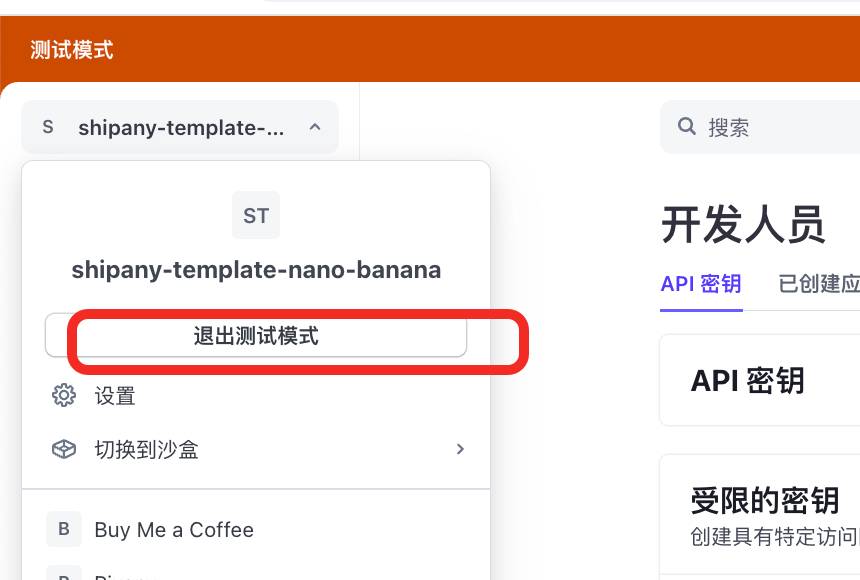 还是刚才的Stripe页面,点击下图退出测试模式