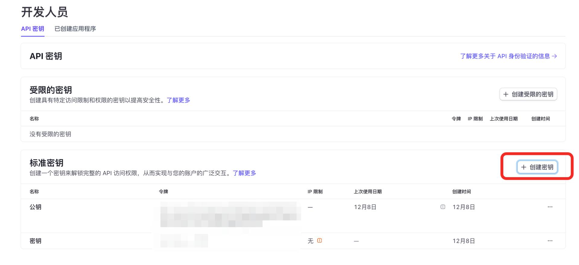 依次选择 Developers -> API keys -> Standard keys -> Create secret key 创建 API 密钥。