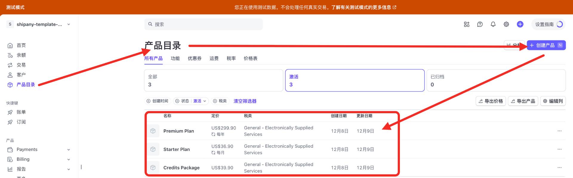 为每个产品创建对应的产品和价格: