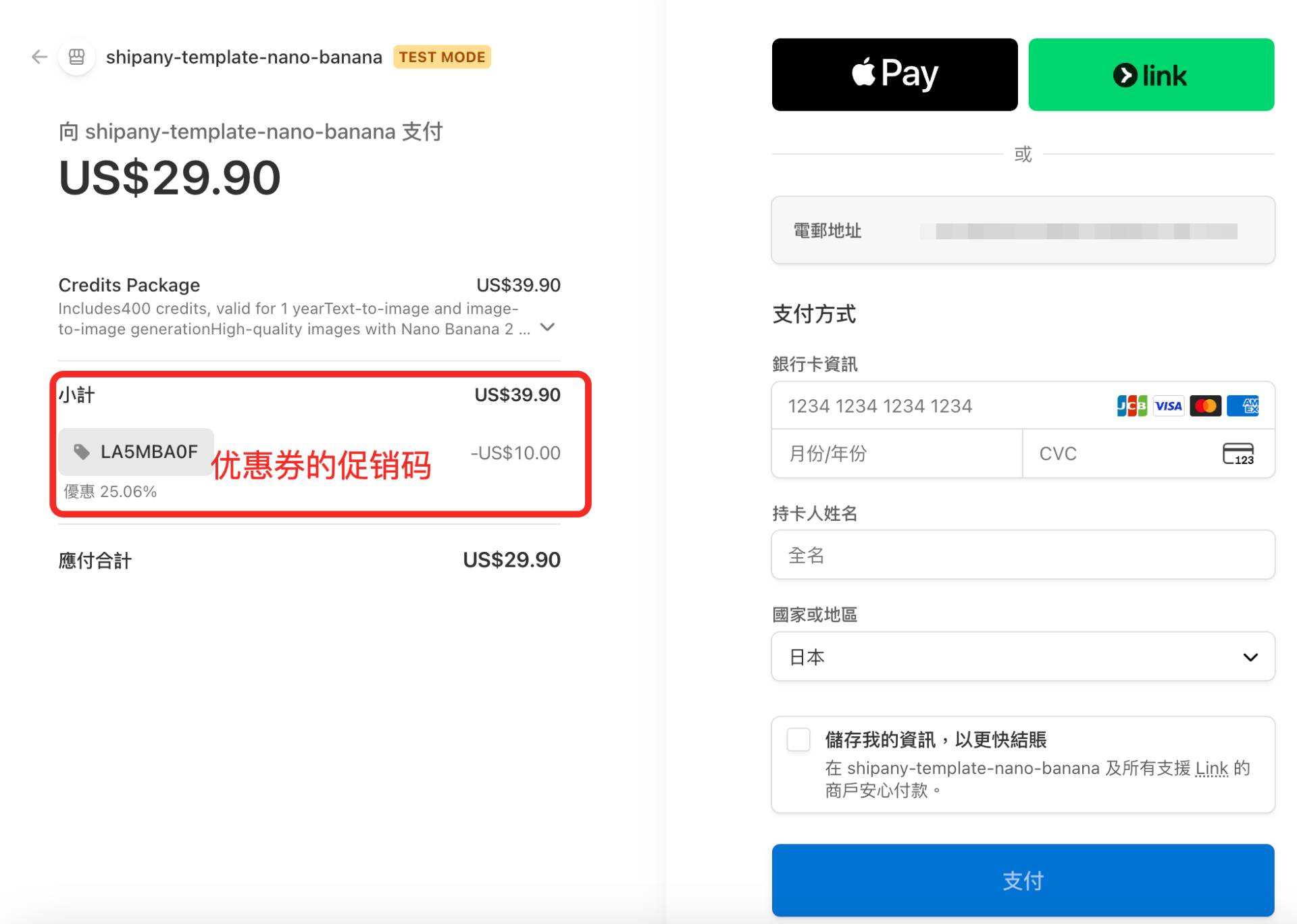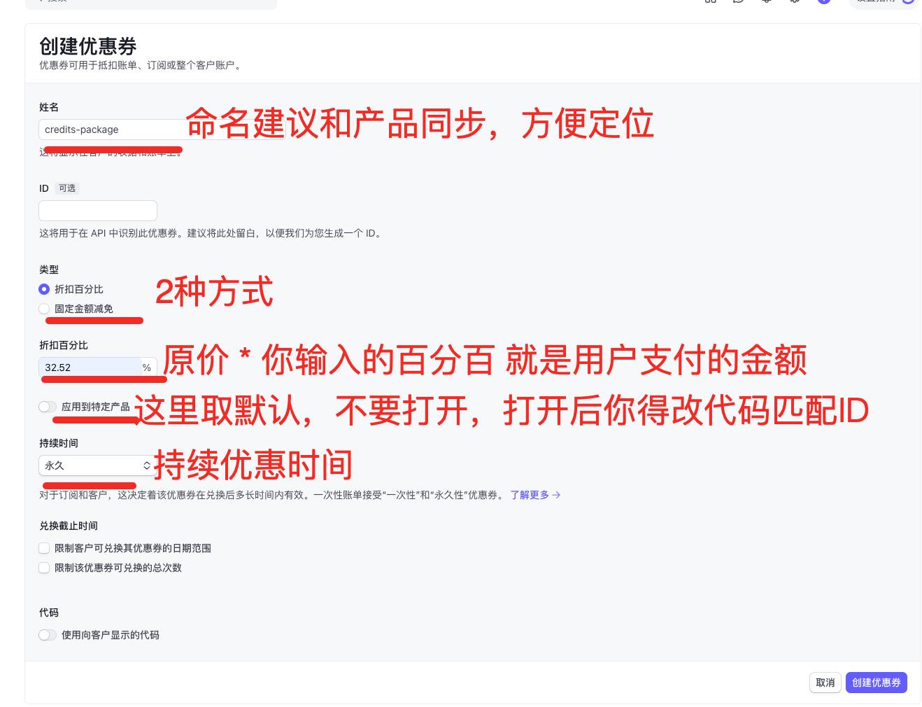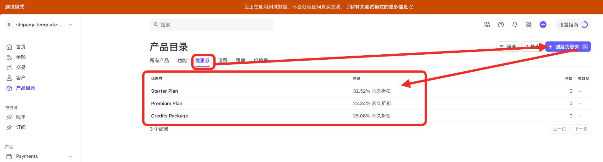 如何创建促销码做优惠(这一步选做,因为你不一定能用上,而且还挺麻烦),以测试模式为例