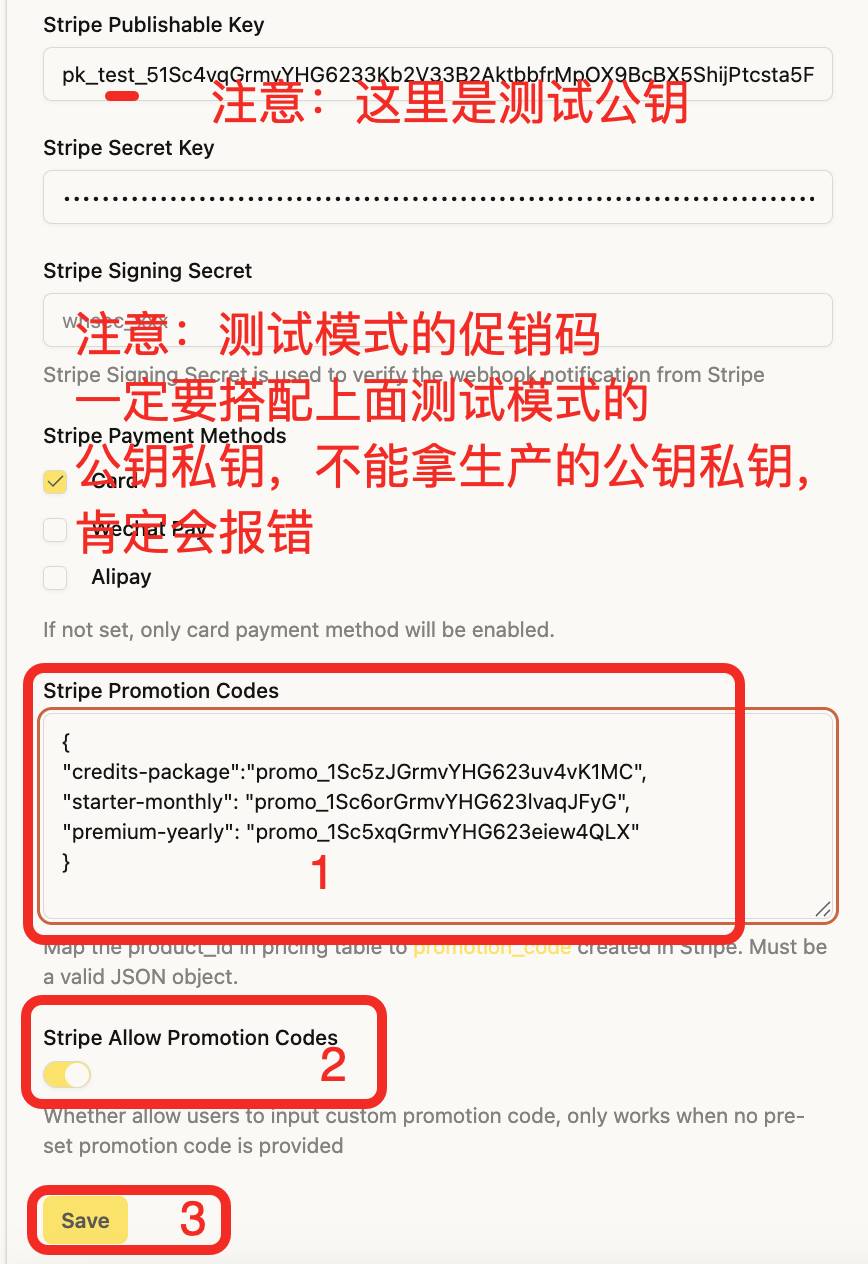 promo_1Sc5zJGrmvYHG623uv4vK1MC→ 关联到 Credits Package 产品promo_1Sc6orGrmvYHG623lvaqJFyG→ 关联到 Starter Plan 产品promo_1Sc5xqGrmvYHG623eiew4QLX→ 关联到 Premium Plan 产品