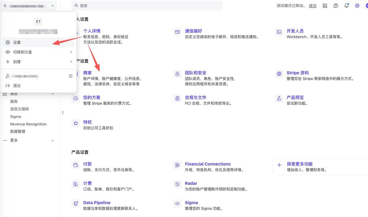- 进入 Stripe 后台首页,点击左上角头像 → 设置