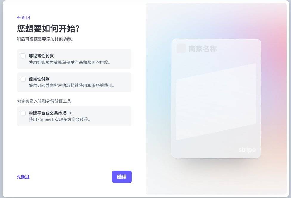 在初始配置中,可以看到“商家设置”和“使用方式”选择,如果是为了快速搭建收款链路,这些步骤可以先点击“跳过”或默认选择。