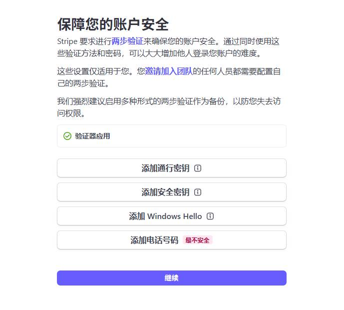 Stripe 涉及资金结算,安全等级极高。推荐使用 Google Authenticator 进行绑定。