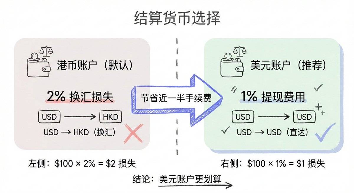 虽然美元提现通常会有约 1% 的提现费用,但相比 2% 的换汇损失,依然能节省近一半的中间手续费。