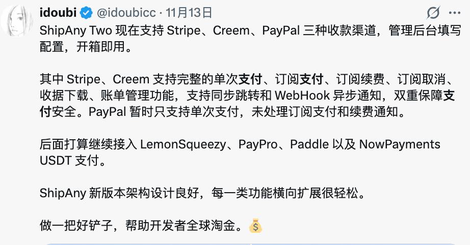 答:基于Paypal方式(项目是基于ShipanyTwo的支付能力,他支持Stripe、Creem、Paypal)
